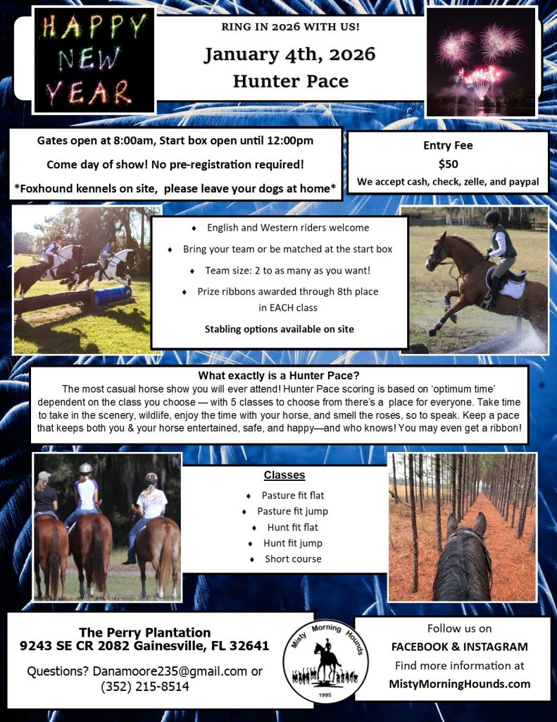 Hunt HotlineInformalMounted at 9:00amLocation: Lochloosa WMABreakfast: PotluckOUR NEXT HUNTER PACE IS COMING UP January 4th, 2025